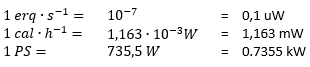 El rendimiento es el trabajo por unidad de tiempo. Su unidad son los J ∙ s-1 = W (vatios). La corriente calórica también se mide en W. Otras unidades del rendimiento se pueden calcular de la siguiente forma: