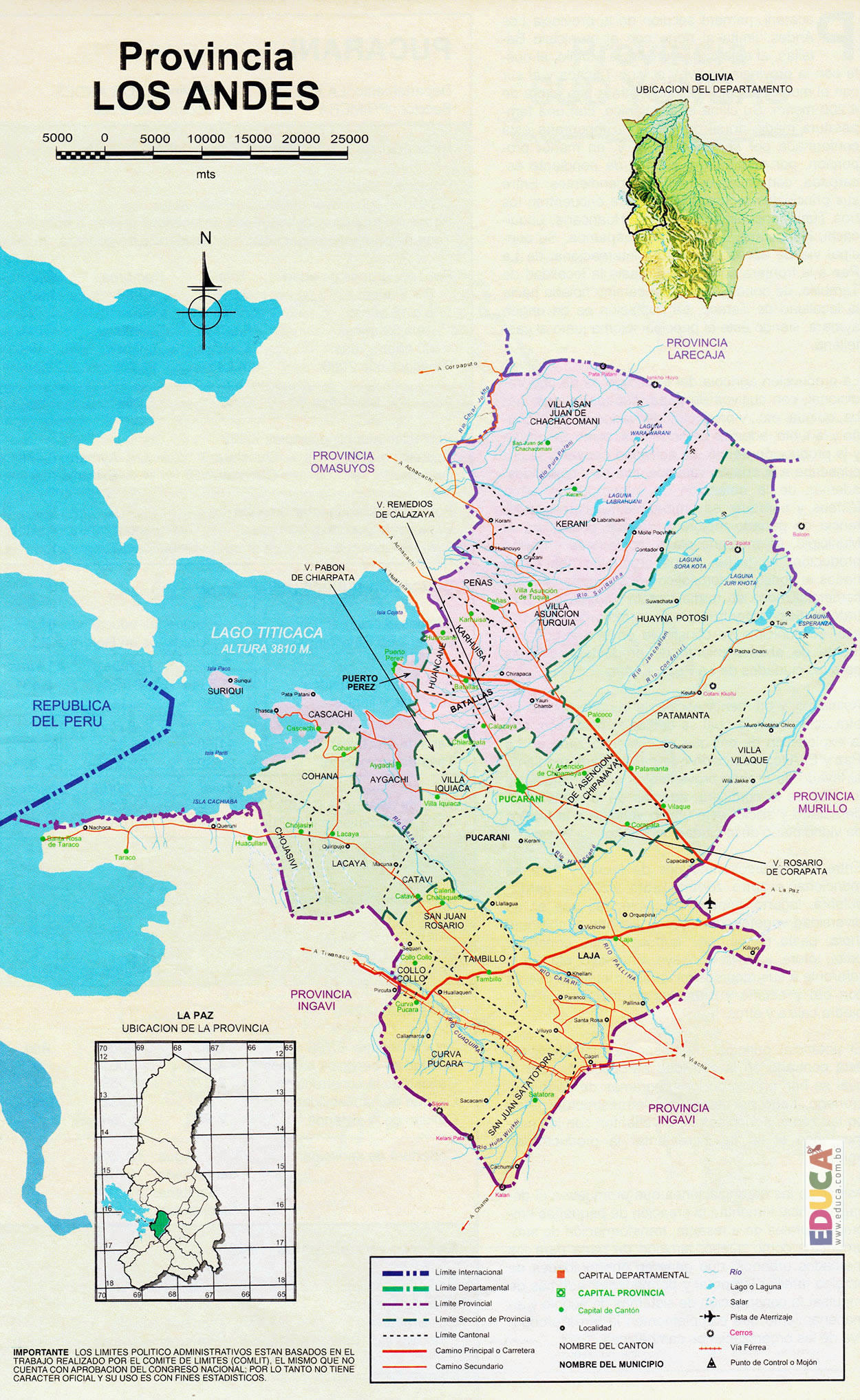 La provincia Los Andes del Departamento de La Paz, República de Bolivia, tiene una extensión de 1.658 Km2 de superficie. Se halla rodeada por las Provincias de Larecaja y Omasuyos al norte, al sur con la Provincia de Ingavi, al este con la Provincia de Pedro Domingo Murillo y al oeste por el Lago Titicaca.